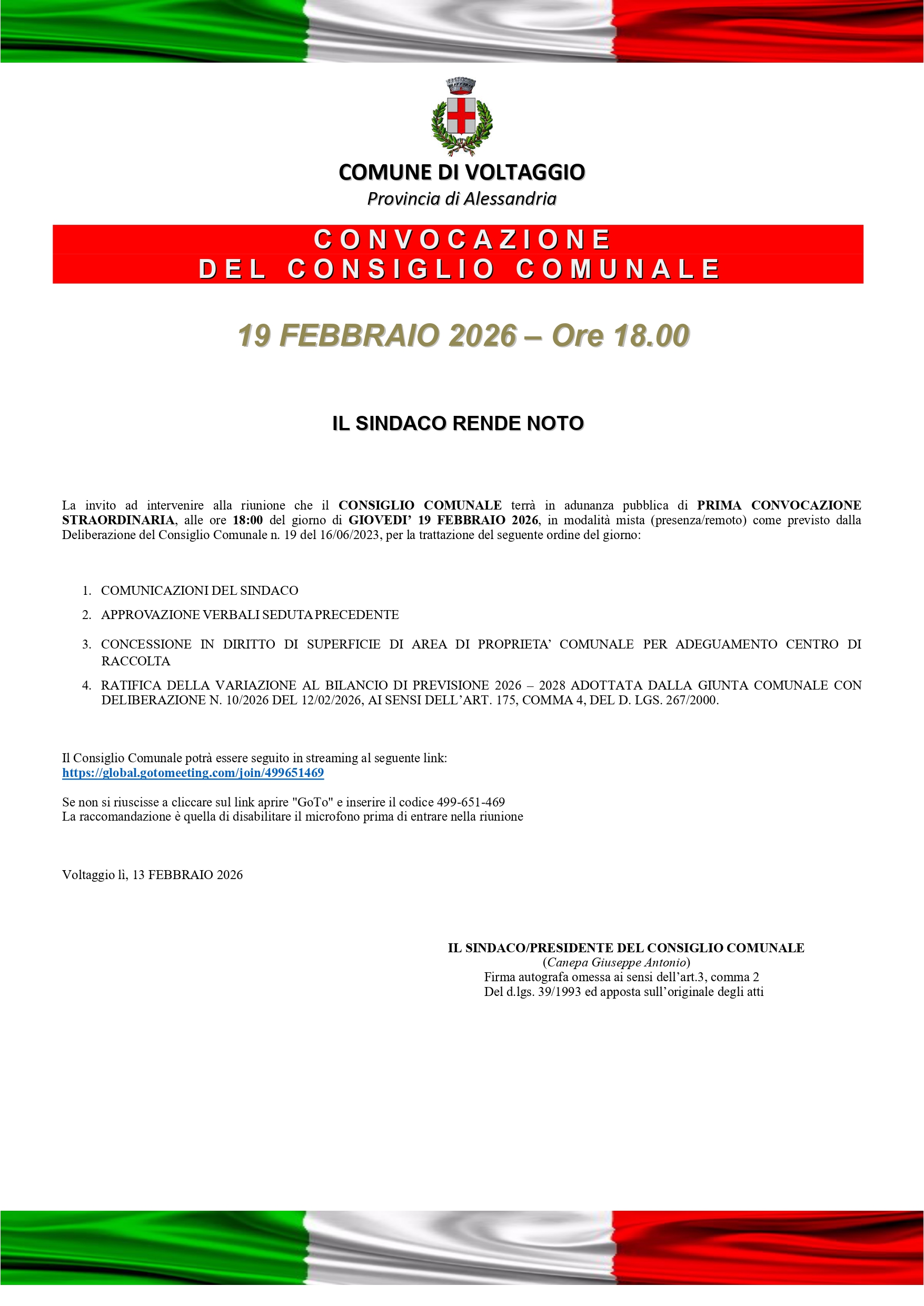 Il Consiglio Comunale si riunirà giovedì 19 febbraio alle ore 18:00 per discutere gli argomenti compresi nell'allegato ordine del giorno